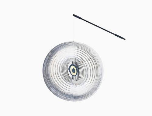 Un attraente giravento con dettagli riflettenti e motivi a occhi per spaventare aironi e altri uccelli lontano dallo stagno.