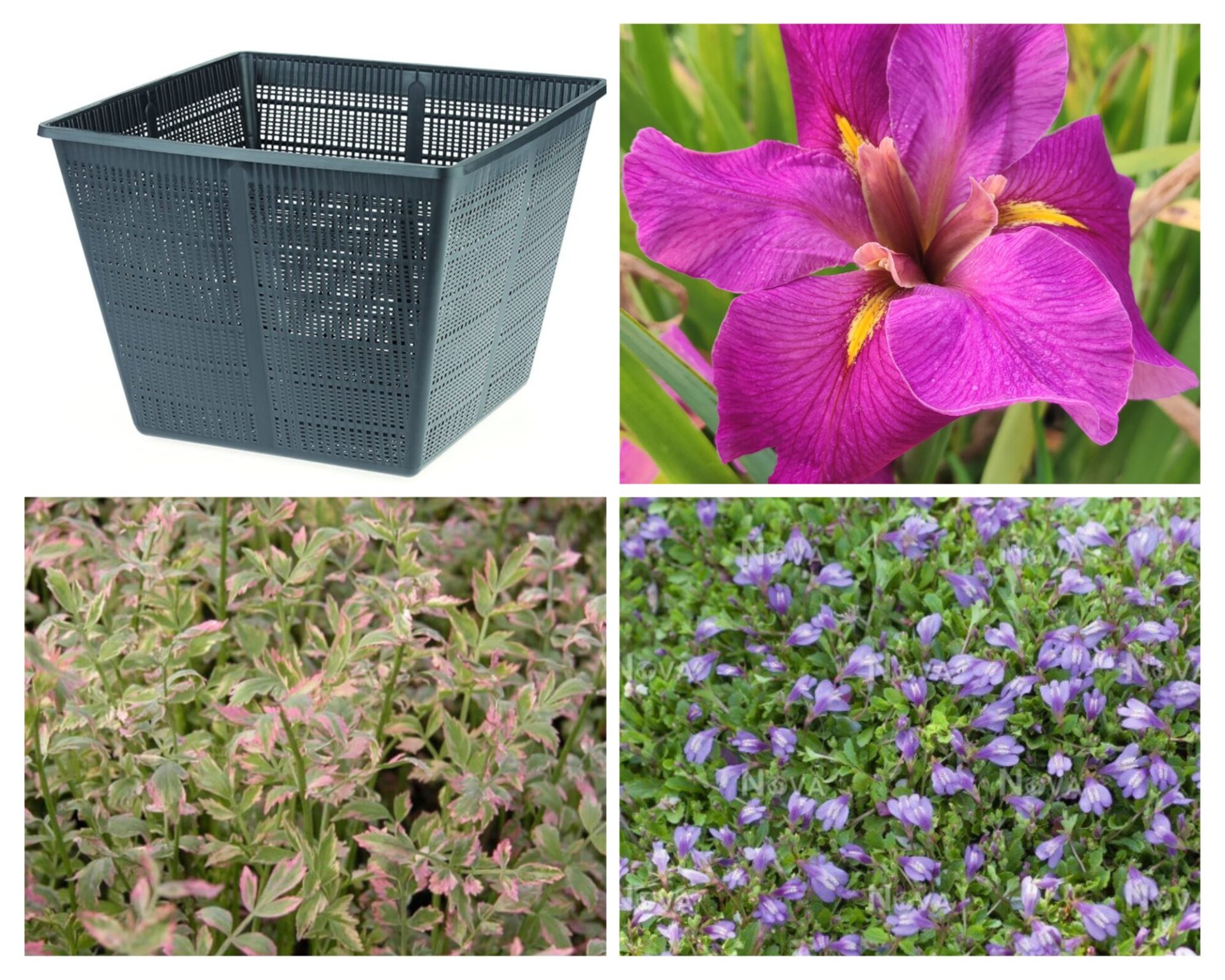 Questo kit contiene 3 piante palustri di altezze e fioriture differenti, ideali per essere inserite in un cestello da 28x28x18 cm. Si consiglia di posizionare le piante più alte sul retro e la pianta tappezzante sul davanti.