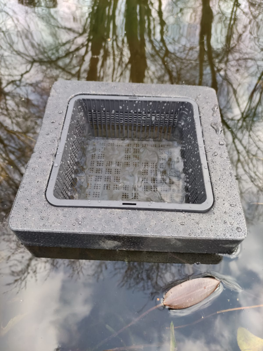 Zattera galleggiante munita di cestello 19×19 ideale per ospitare fino a due/tre piante palustri, che grazie al cestello forato possono produrre radici fluttuanti in grado di svolgere una notevole azione fitodepurante.