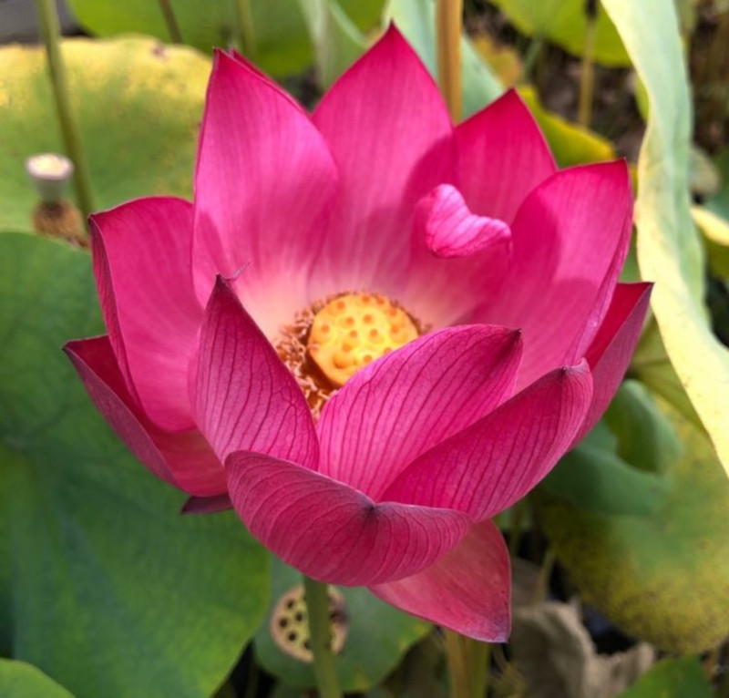 Il Nelumbo ‘Huo Hua’, chiamato comunemente fior di loto, è una pianta acquatica a rapida crescita. Solo le prime foglie, come le ninfee, fluttuano sull’acqua, mentre tutte le altre svettano verso il cielo raggiungendo l’altezza media di 60 cm. Le foglie di forma piatta o leggermente ad imbuto, di colore verde azzurrognolo sono sorrette da peduncoli leggermente spinosi. I fiori emergono dal fogliame per sbocciare in pieno sole e possono raggiungere 15 cm; il colore è rosa intenso con la base dei petali sul bianco. Anche i frutti sono molto ornamentali, spesso usati per decorazioni floreali.