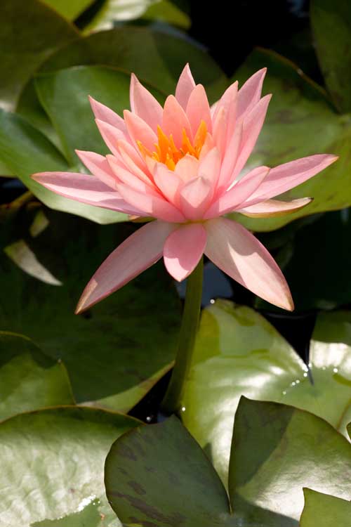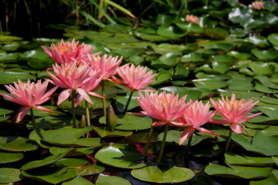 I suoi fiori stellati di color salmone uniforme si alzano di 20 cm sull’acqua. Vigorosa e facile da coltivare. Pianta molto fiorifera.