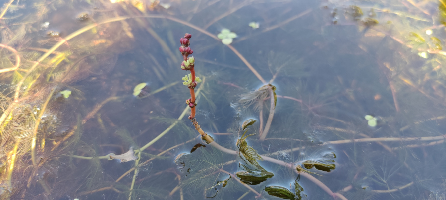 Pianta nativa dell’Eurasia il Myriophyllum spicatum tende a formare grossi gruppi densi sul fondo dei nostri laghetti. I suoi gambi filiformi variano dal marrone al rossiccio a seconda delle temperature. Produce piccole infiorescenze rosse che fuoriescono dall’acqua, se raggiunge la superficie. Si moltiplica per via vegetativa. Ogni frammento di gambo da origine ad una nuova pianta.